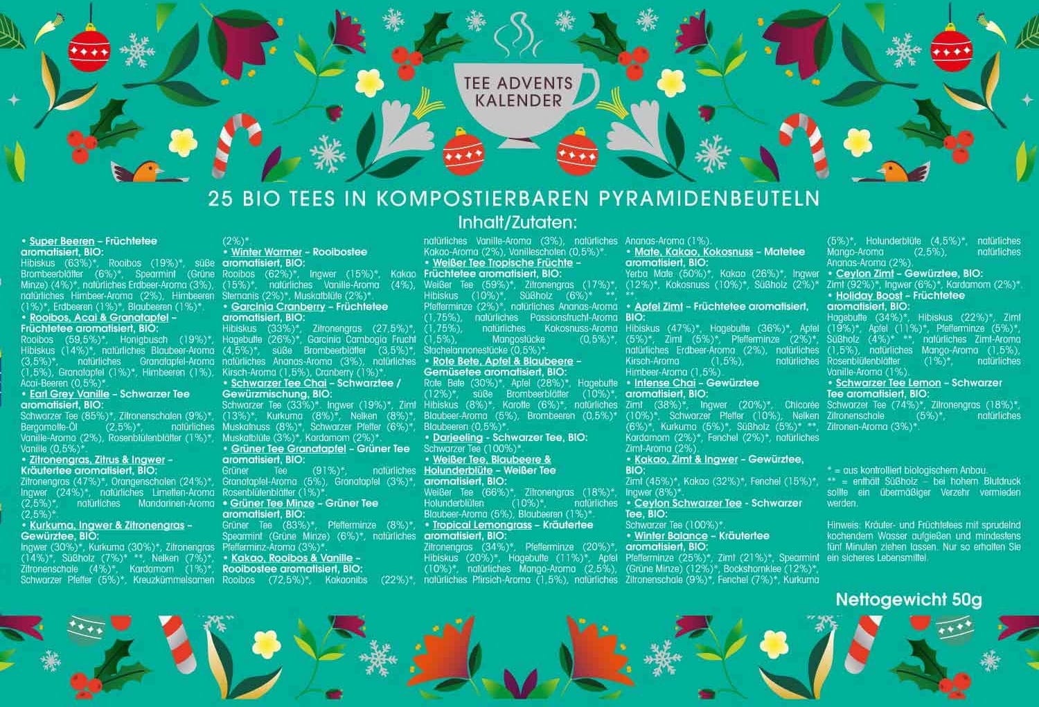 The tea varieties in the "Christmas Vibes Only" Advent calendar include black & green teas as well as herbal, fruit, spice and mate teas. All teas are organic and each bag is enough to make a pot of tea.