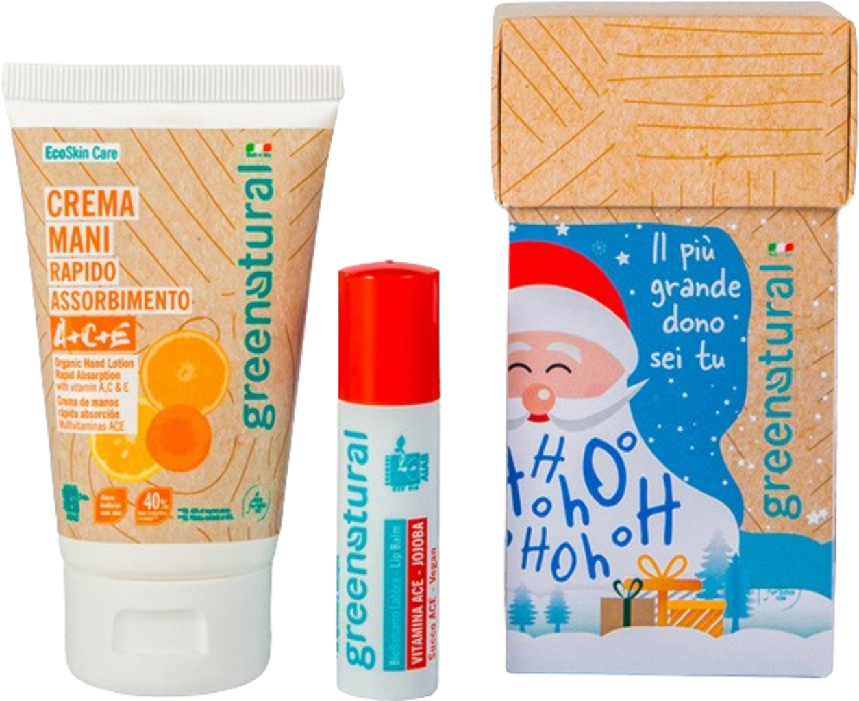The "Happy Santa" Gift Box contains the hand cream and lip balm from the ACE line, 2 intensive-care products for the lips and hands. Perfect for gift giving.