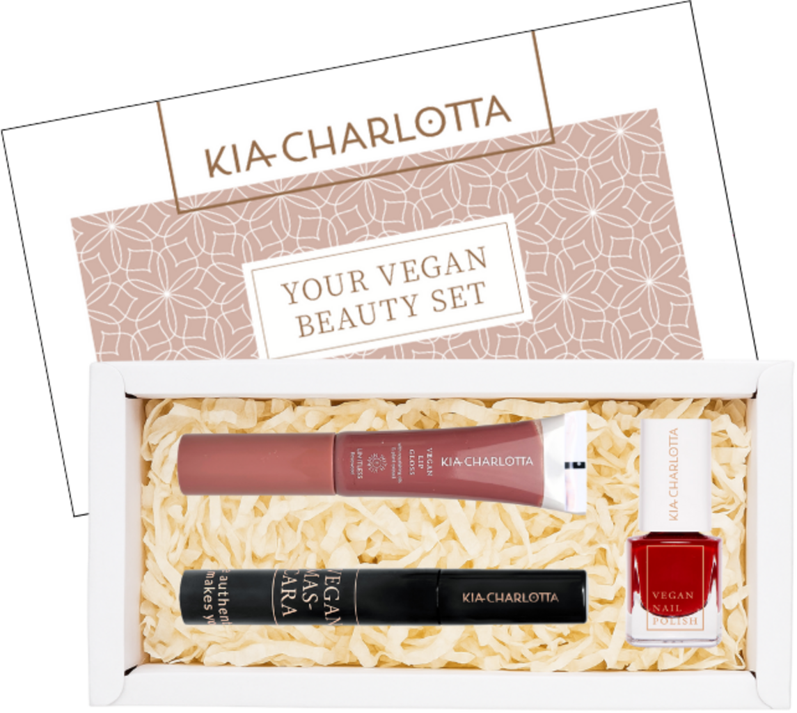 The Essentials X-Mas Set by KIA-CHARLOTTA contains everything you need for a beautiful festive look: a black mascara, a shiny lip gloss, and a sophisticated red nail polish - the perfect Christmas glow.