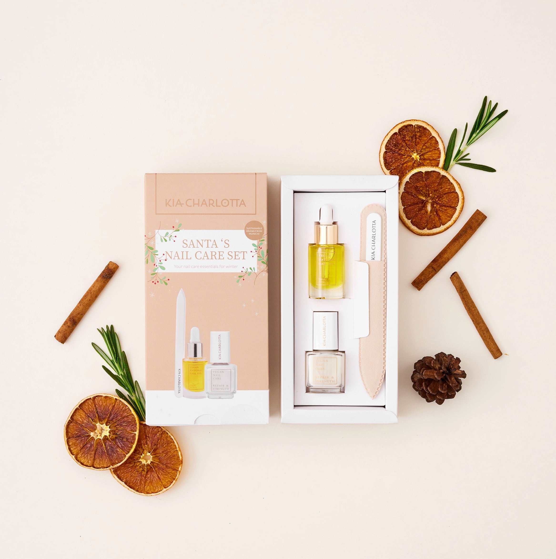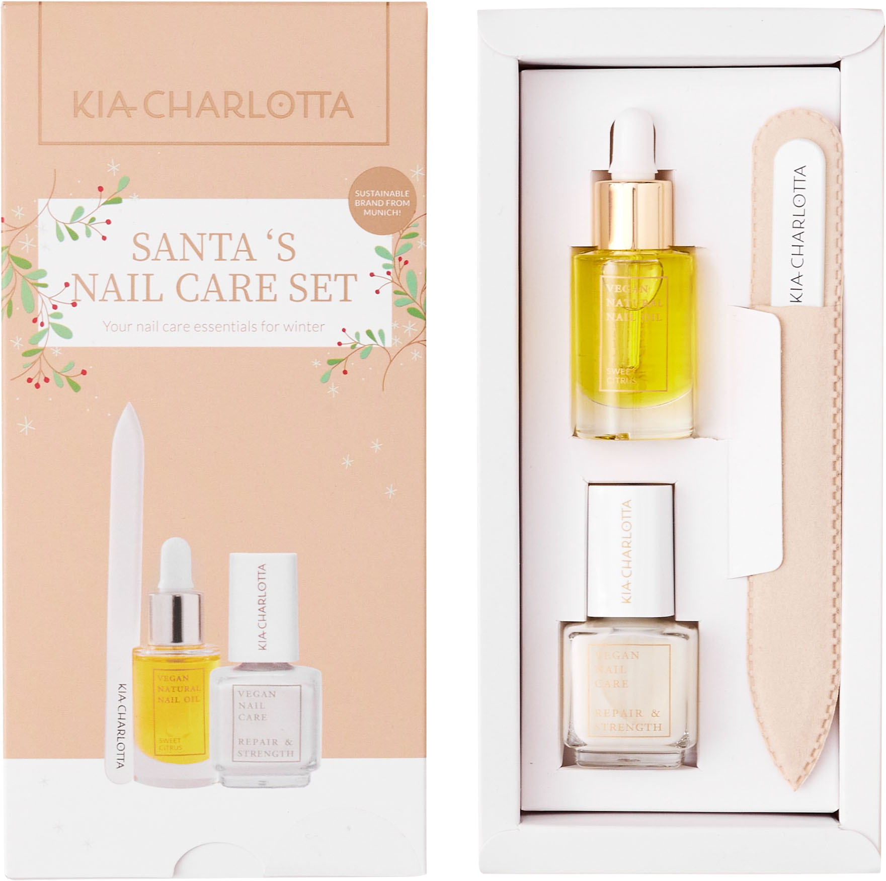 The Santa's Nail Care X-Mas Set by KIA-CHARLOTTA offers everything you need for well-groomed and glamorous nails. The combination of a nourishing nail hardener, a nourishing nail oil and a high-quality nail file ensures the perfect manicure. Packaged in a beautifully designed box, this set is the ideal gift idea for your loved ones or as a little treat for yourself.