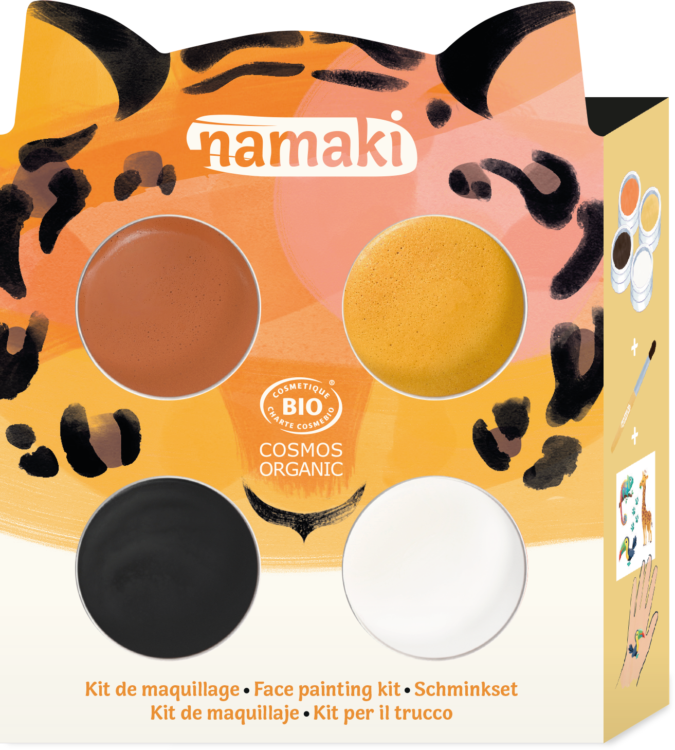 The tiger make-up set contains the colours black, white, orange and golden yellow, making it easy to create a tiger, leopard, fox or even a cute giraffe. A matching sheet of temporary tattoos is included to round off the make-up kit.