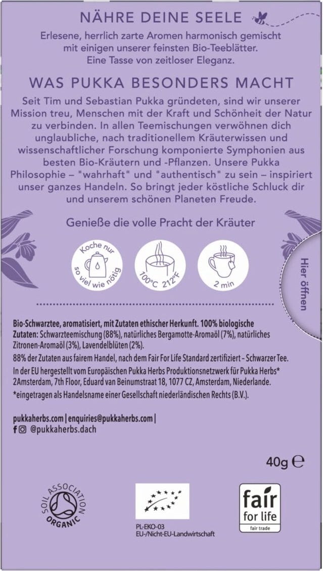 | Responsible food business operator: | Lipton Teas and Infusions Germany GmbH, Axel-Springer-Platz 3, c/o WeWork, 20355, Hamburg, Germany, kontakt@pukkaherbs.de |